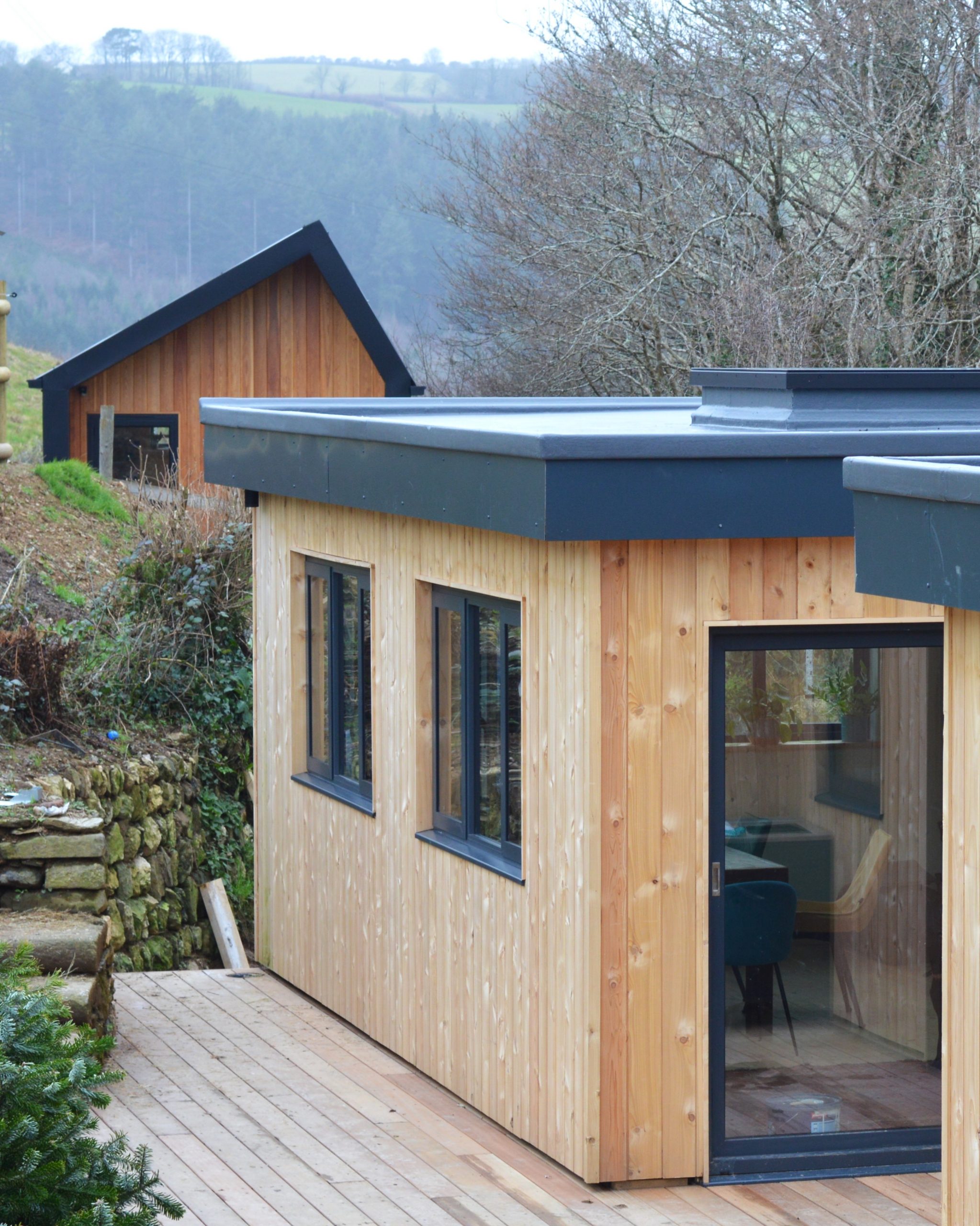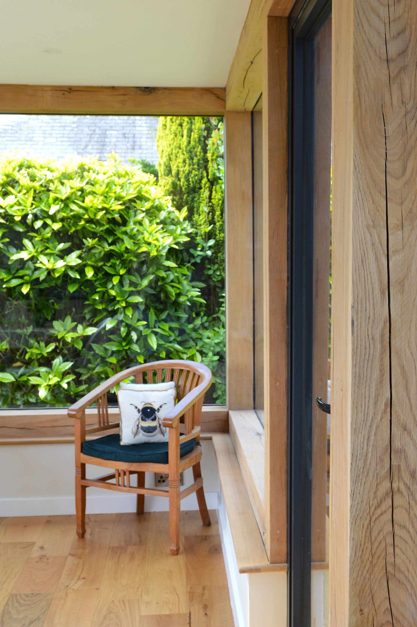 anthracite metal windows on timber framed annexe cornwallvelvet armchair on wooden floor in lounge of annexe