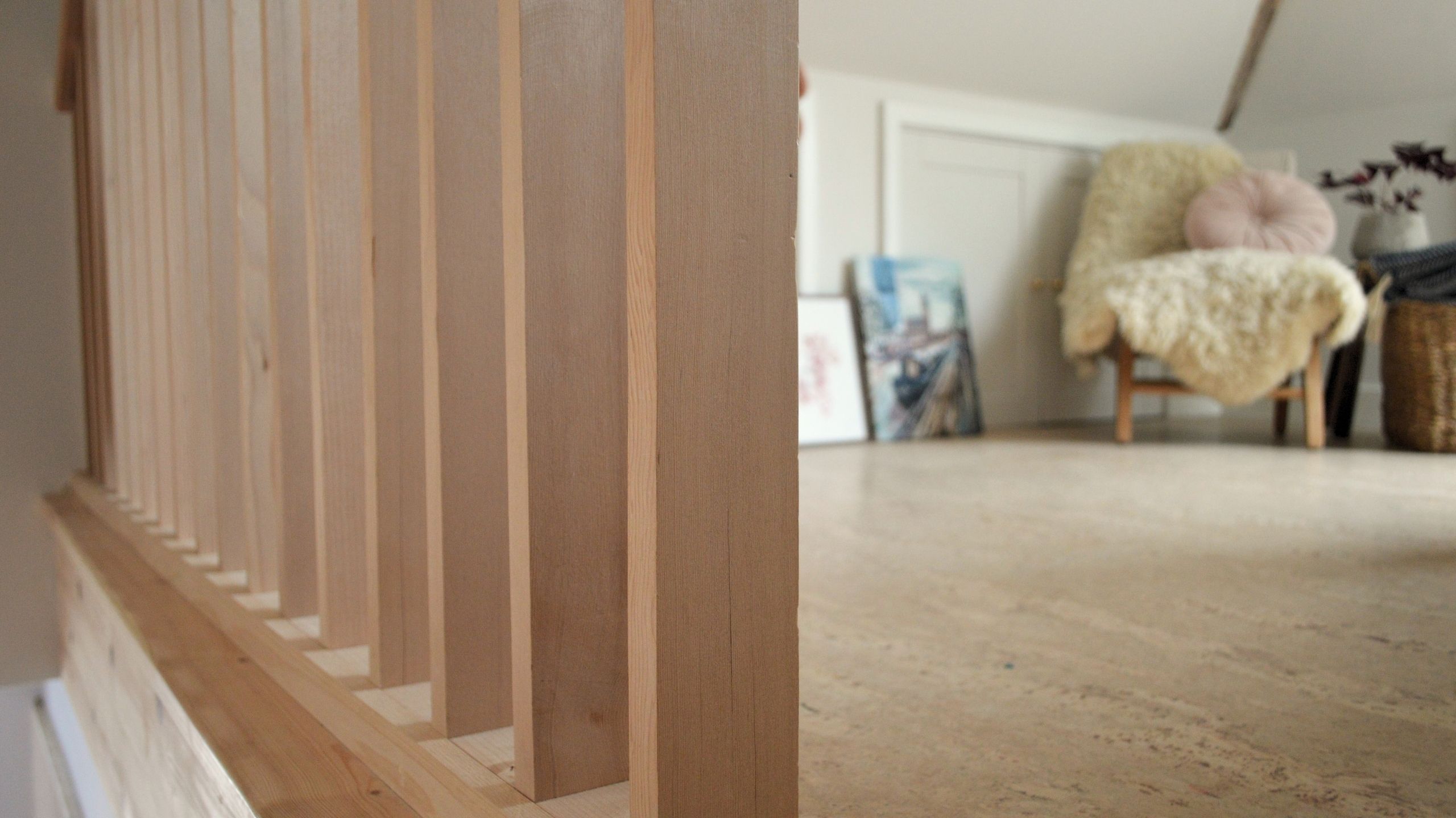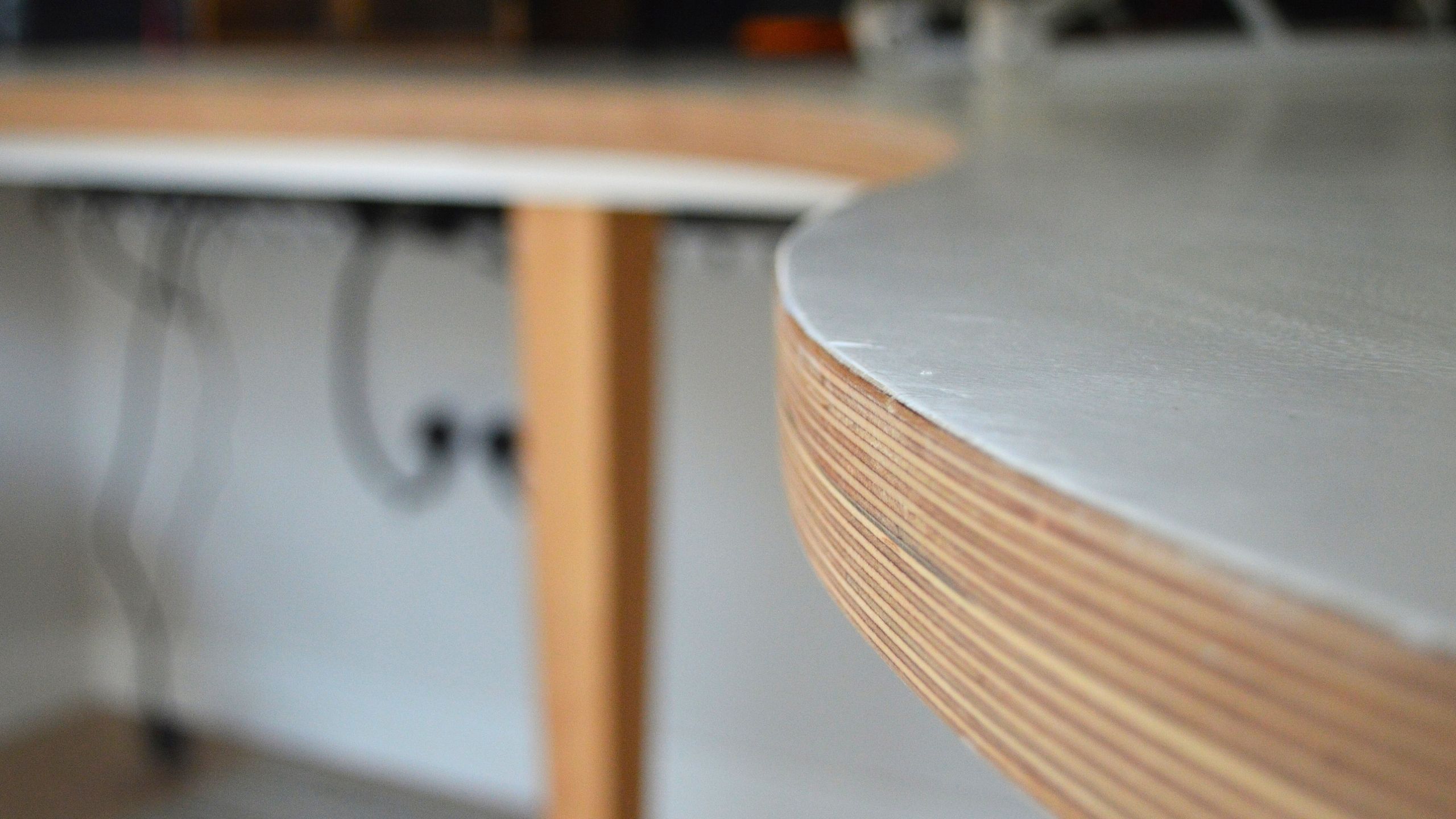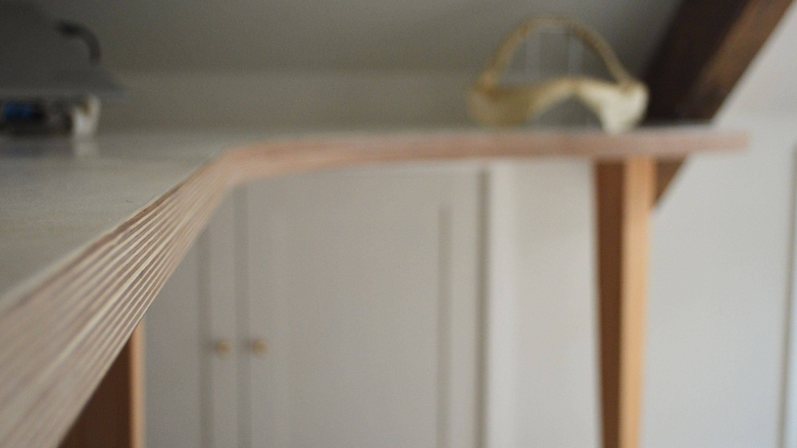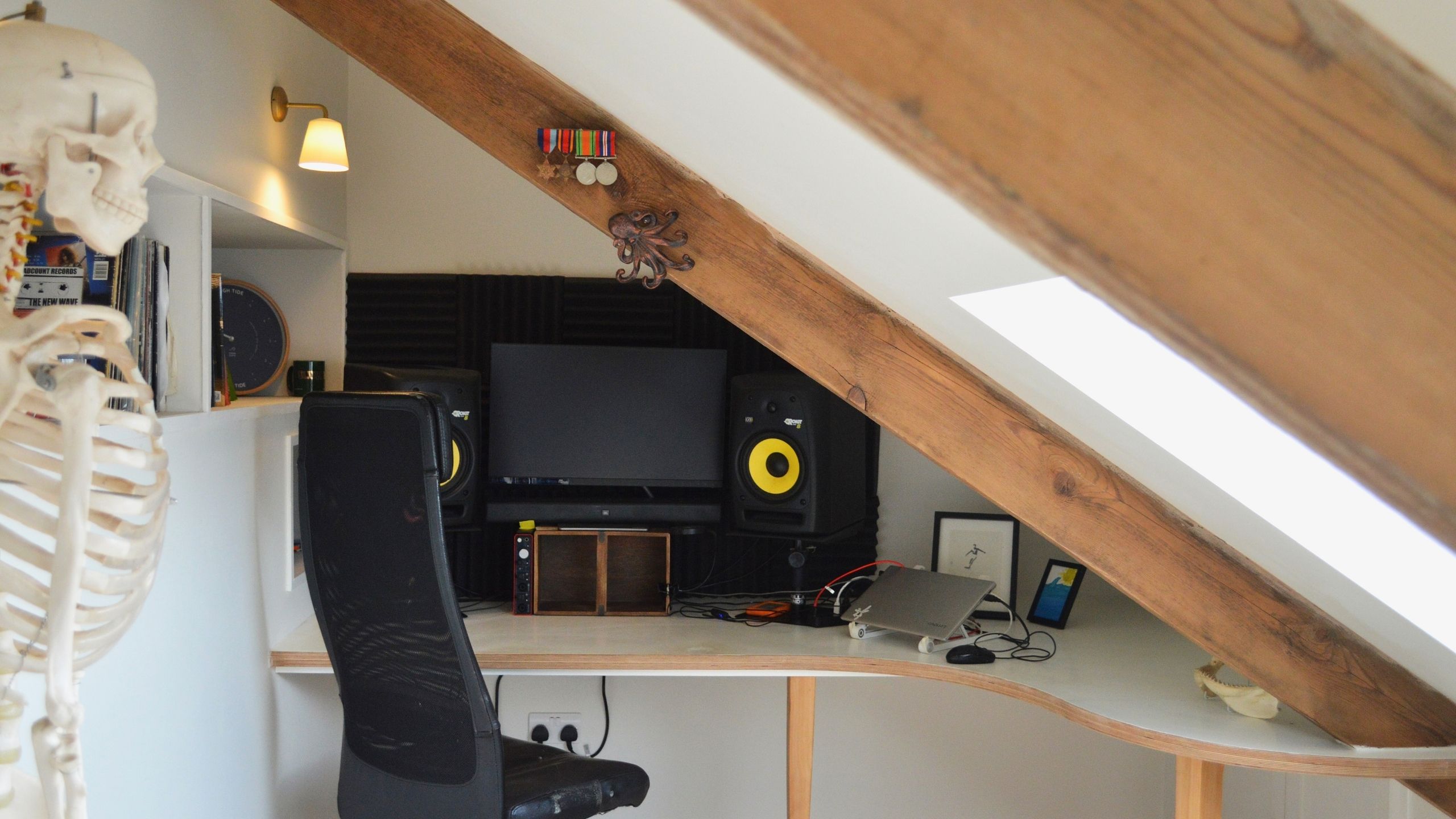 The clients chose a cork floor which lends subtle softness and warmth to the space, and we built a bespoke curved birch plywood desk to perfectly fit the space.