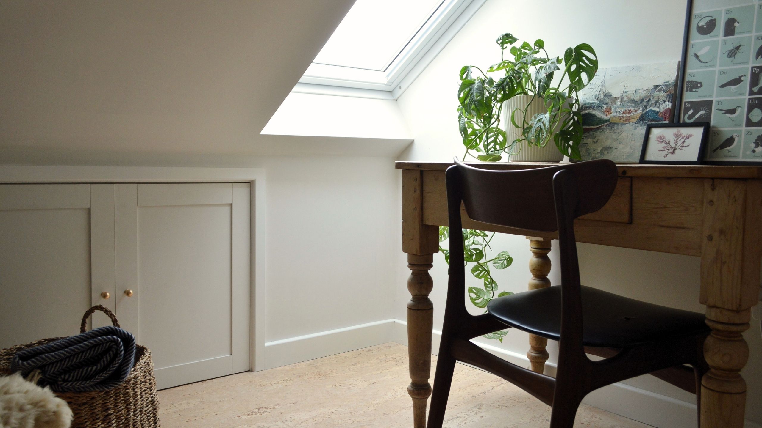 The roof was insulated from below and new wiring installed throughout before the entire space was plaster boarded, plastered and decorated. Custom made eaves cupboards were built along the entire length of the of the house, and some recessed shelf storage was added to the main office area to maximise functionality.
