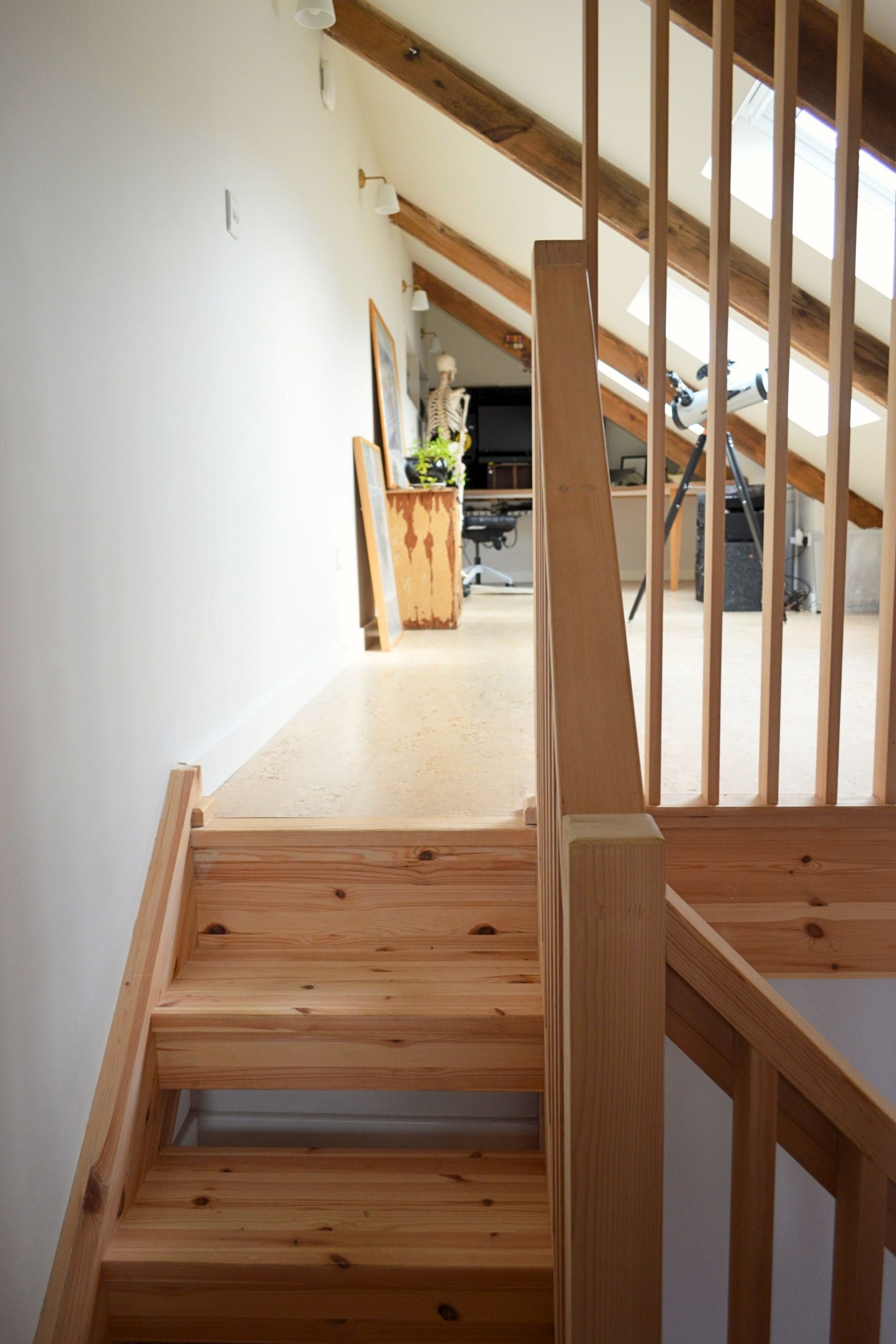 A loft conversion of two halves, creating a pair of distinct and flexible working spaces linked by an open staircase and bespoke hemlock balustrading.
