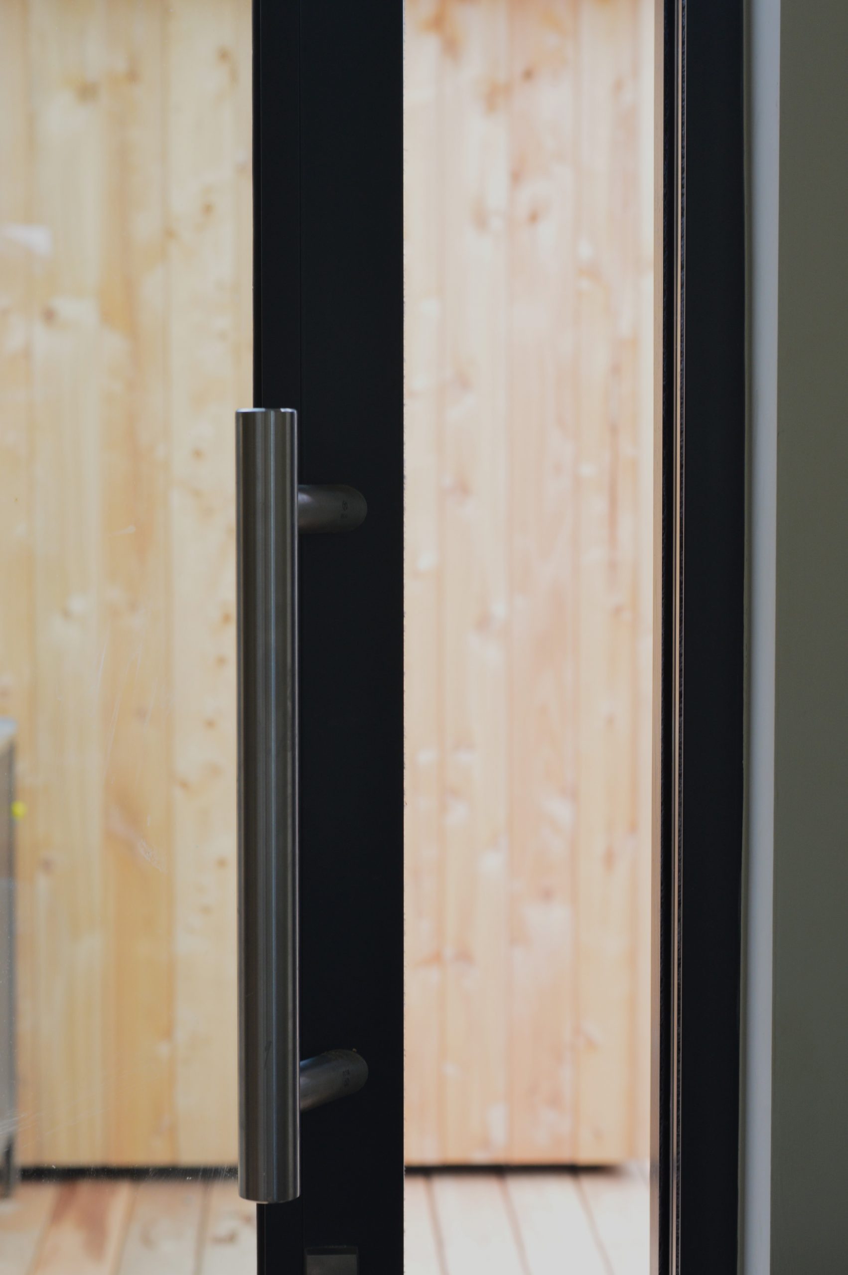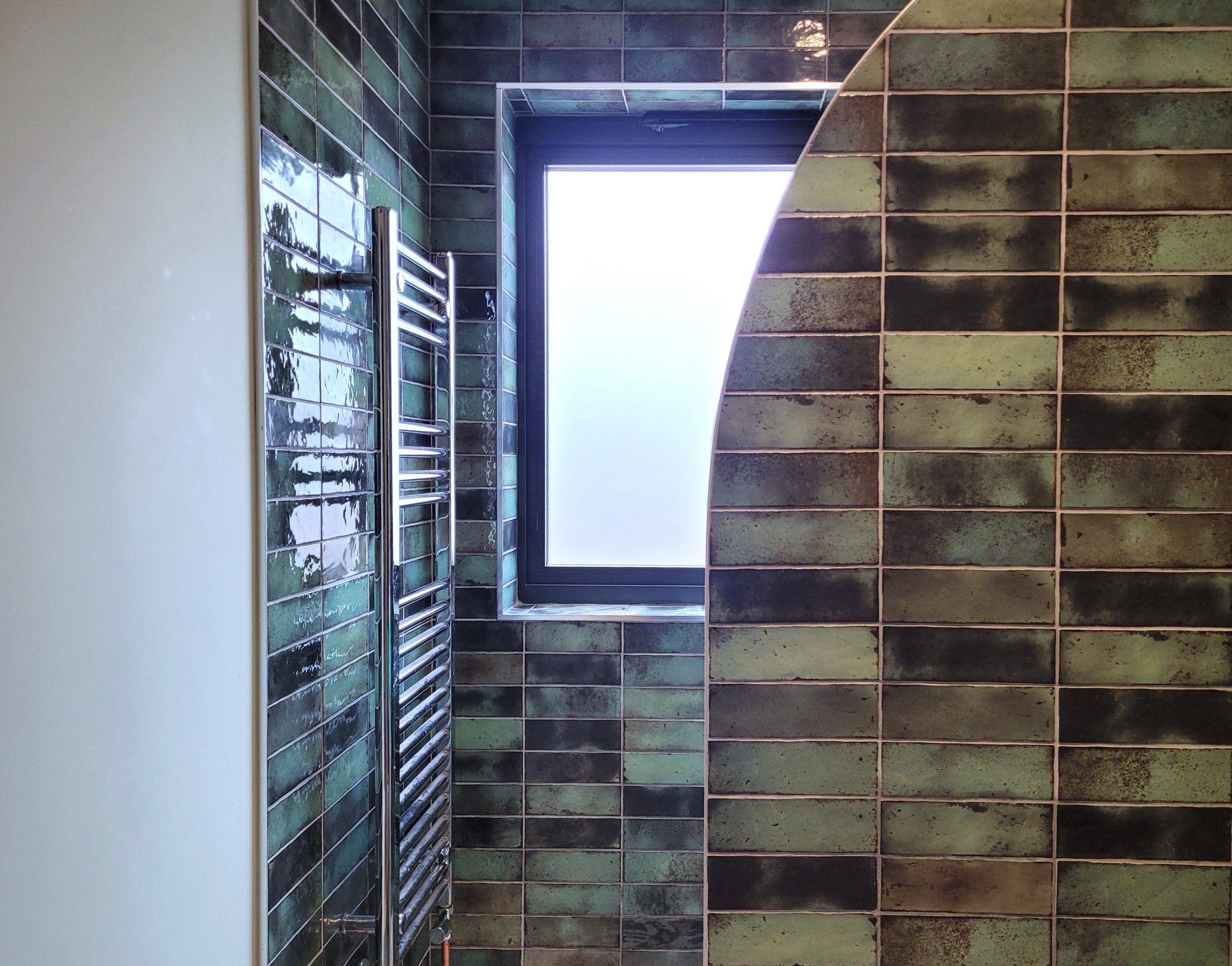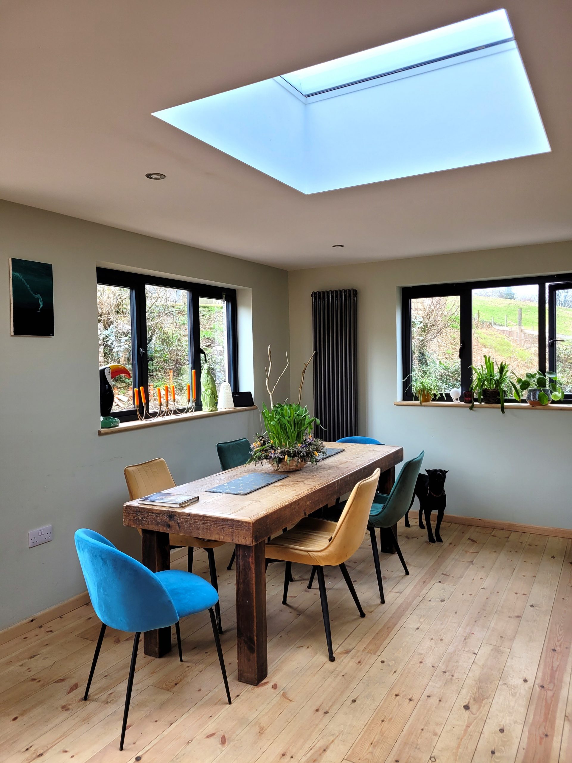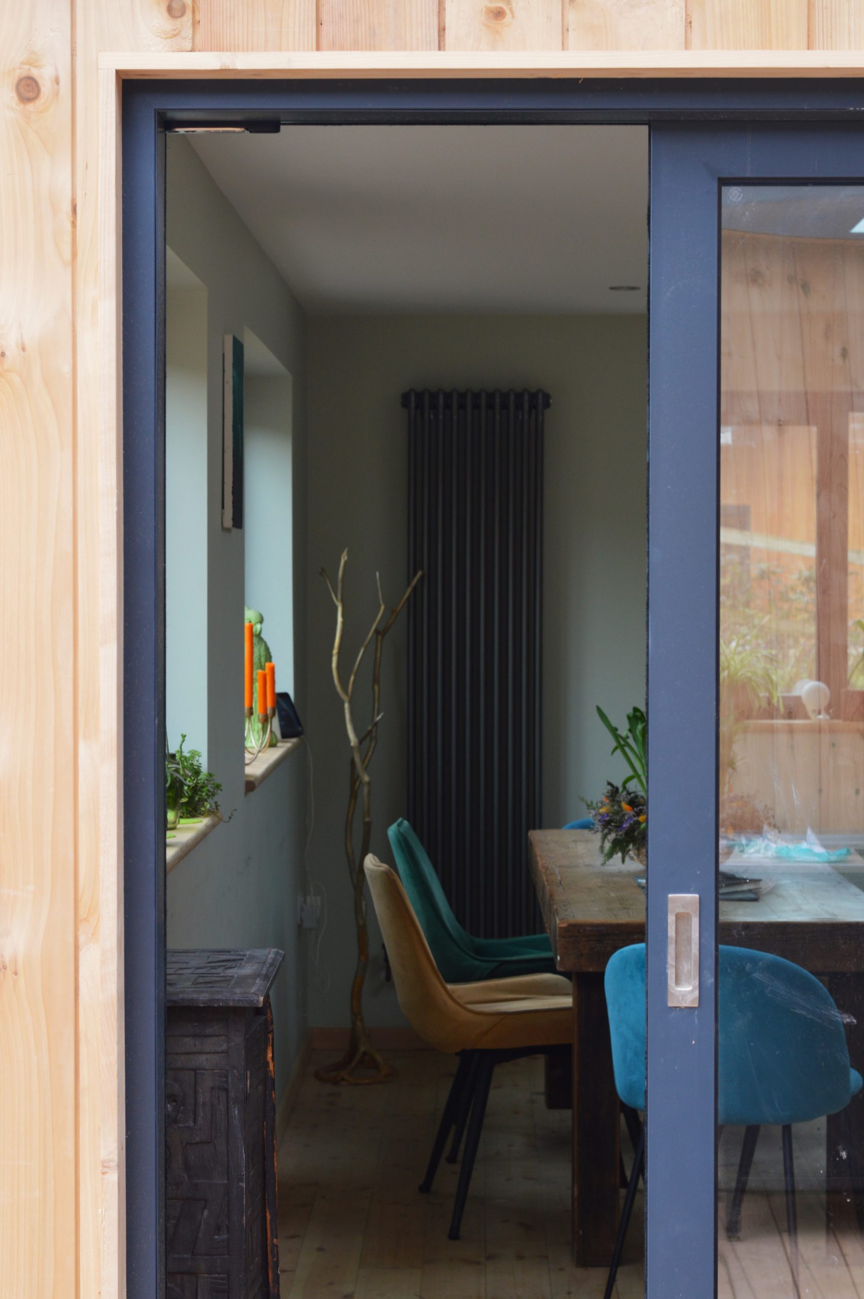 The showstopper of the dining room is the enormous glazed sliding door in slimline aluminium, supplied by the ever tip-top Green Circle Bespoke Glazing.  The fixed pane forms a huge internal window between the dining room and entrance hallway, which floods the building with light whilst maintaining separate spaces.
