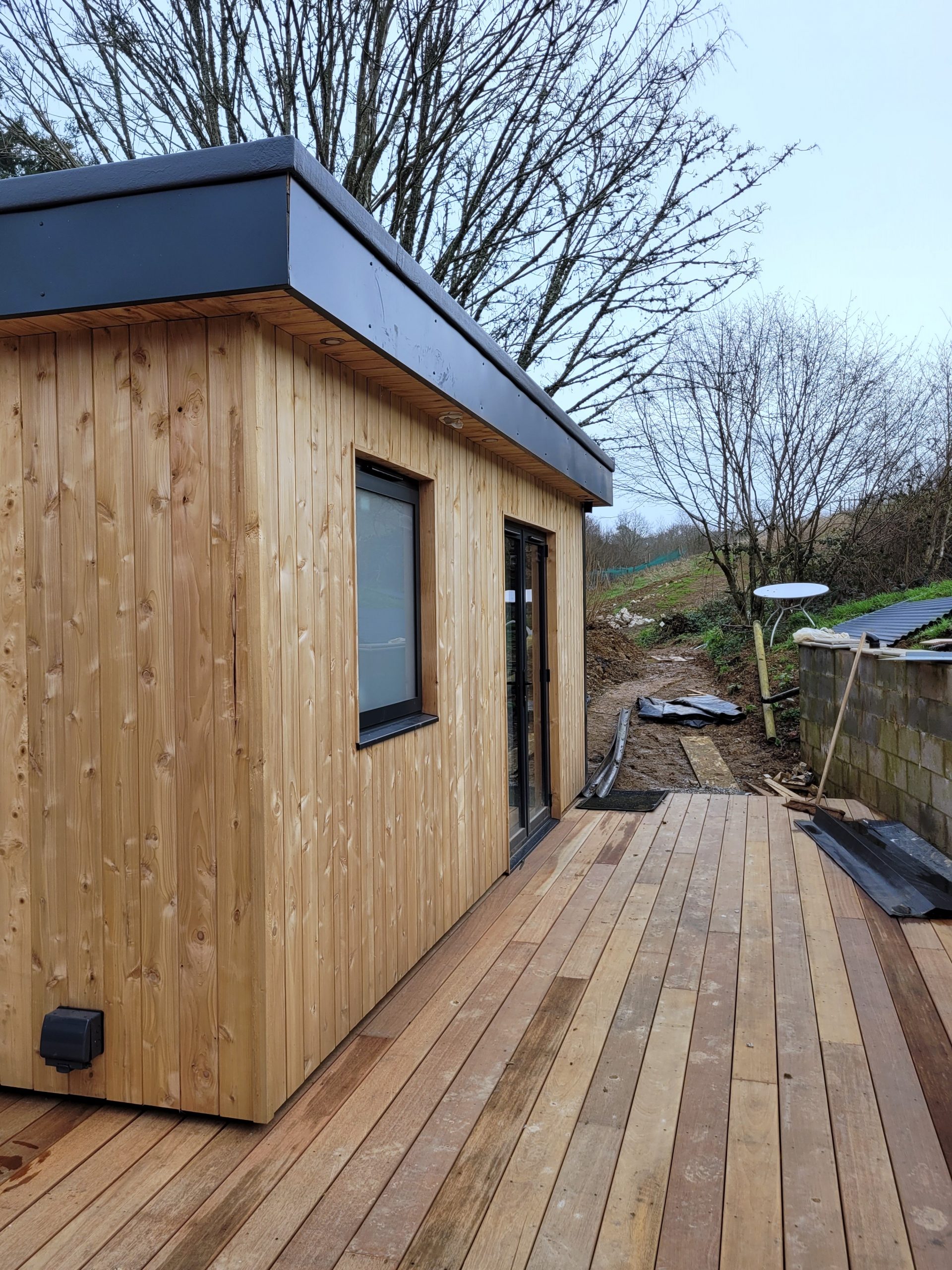 The entire extension and integrated deck is built on ground screws, which enabled us to leave the original foundations and root systems of large nearby trees entirely undisturbed.  We use ground screws frequently, particularly when installing our HUSK Pods.