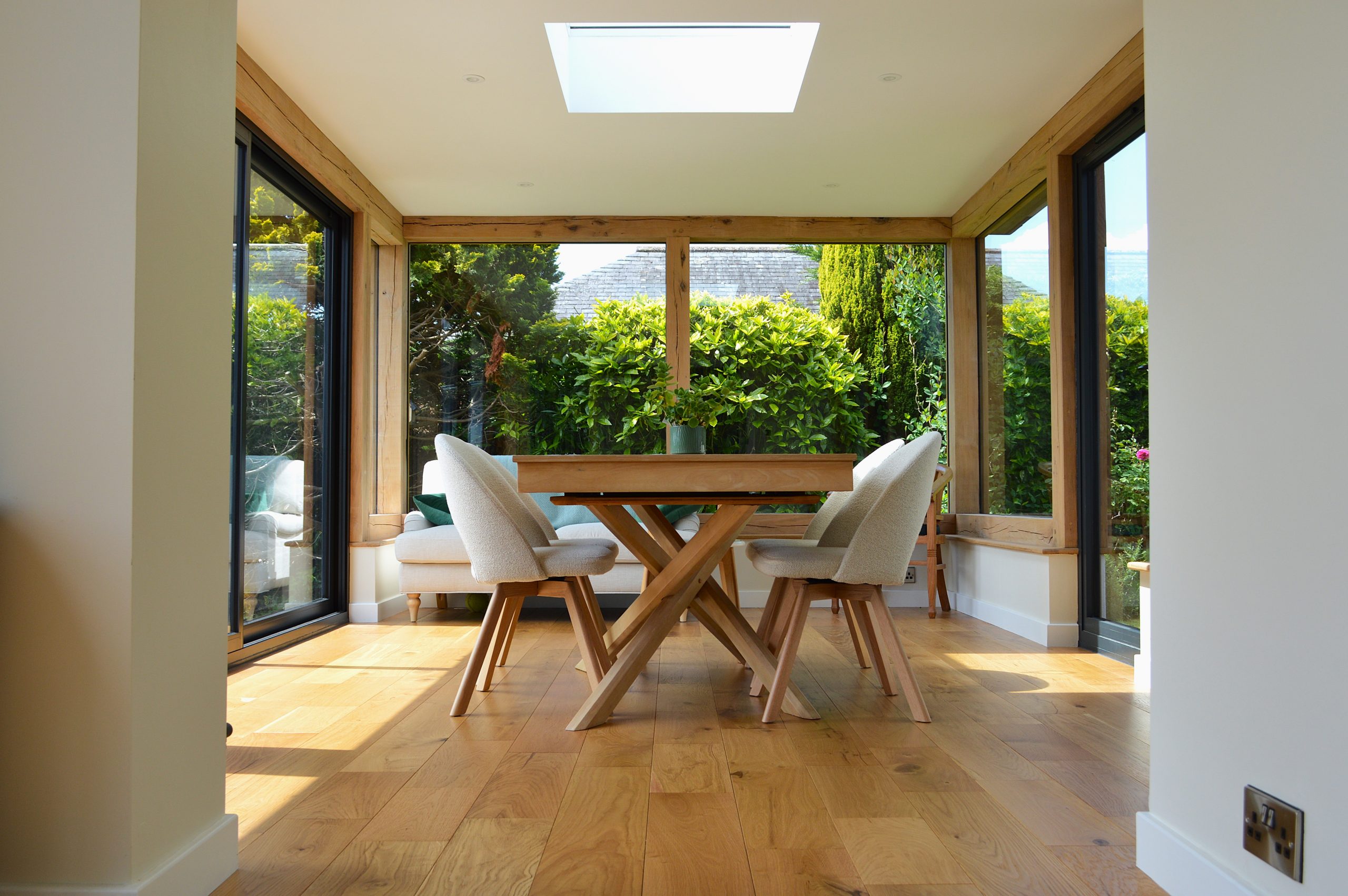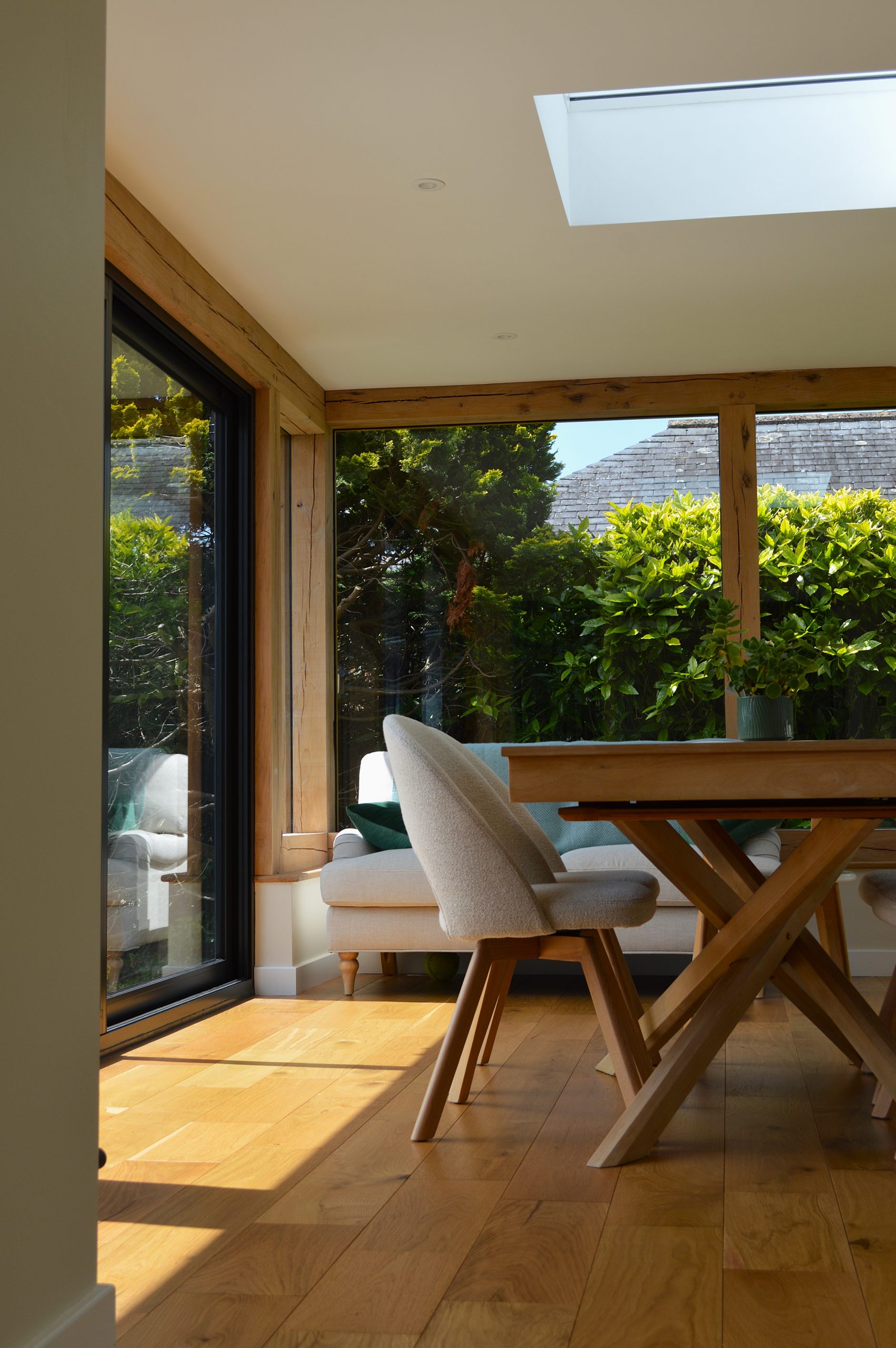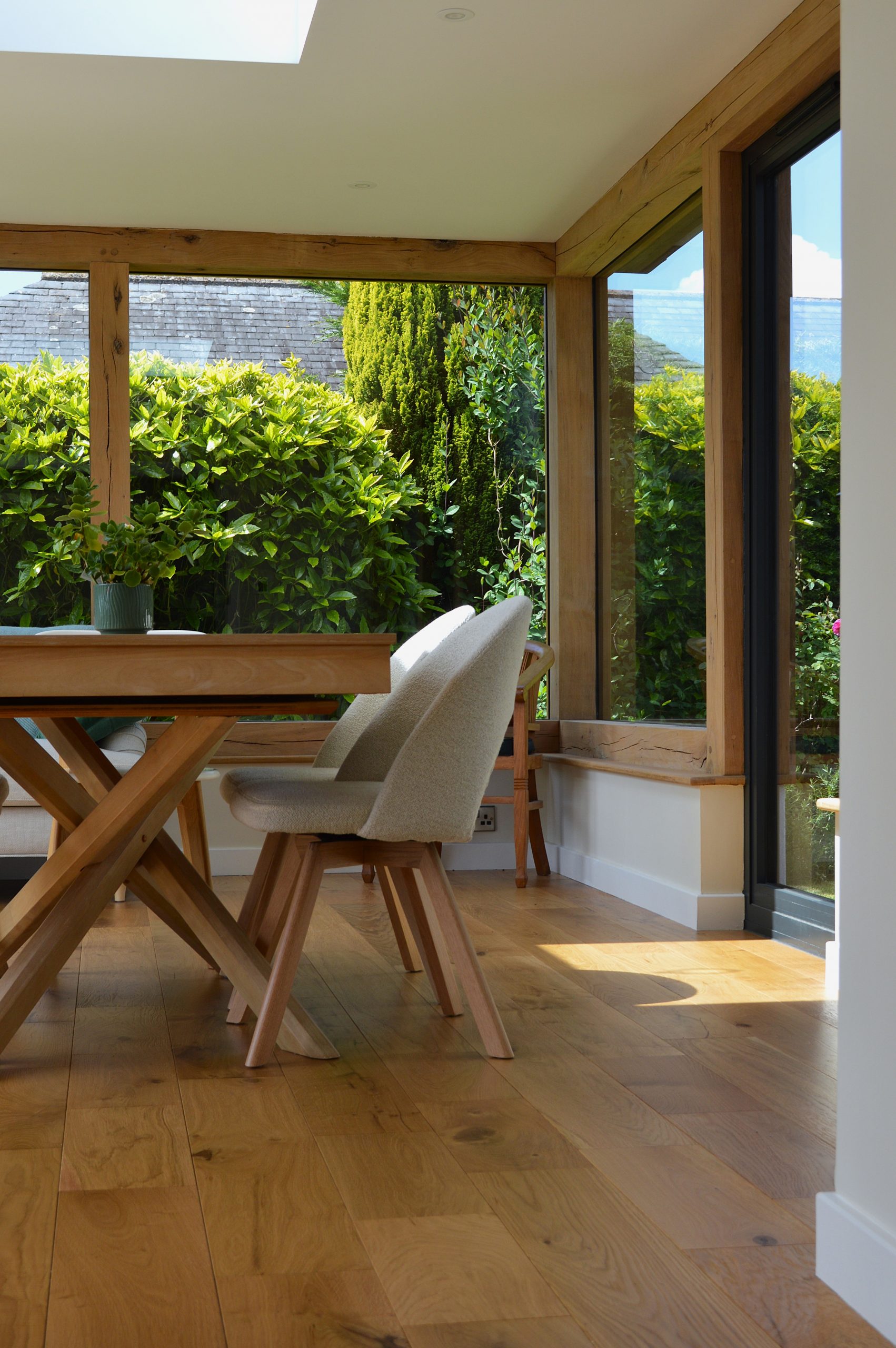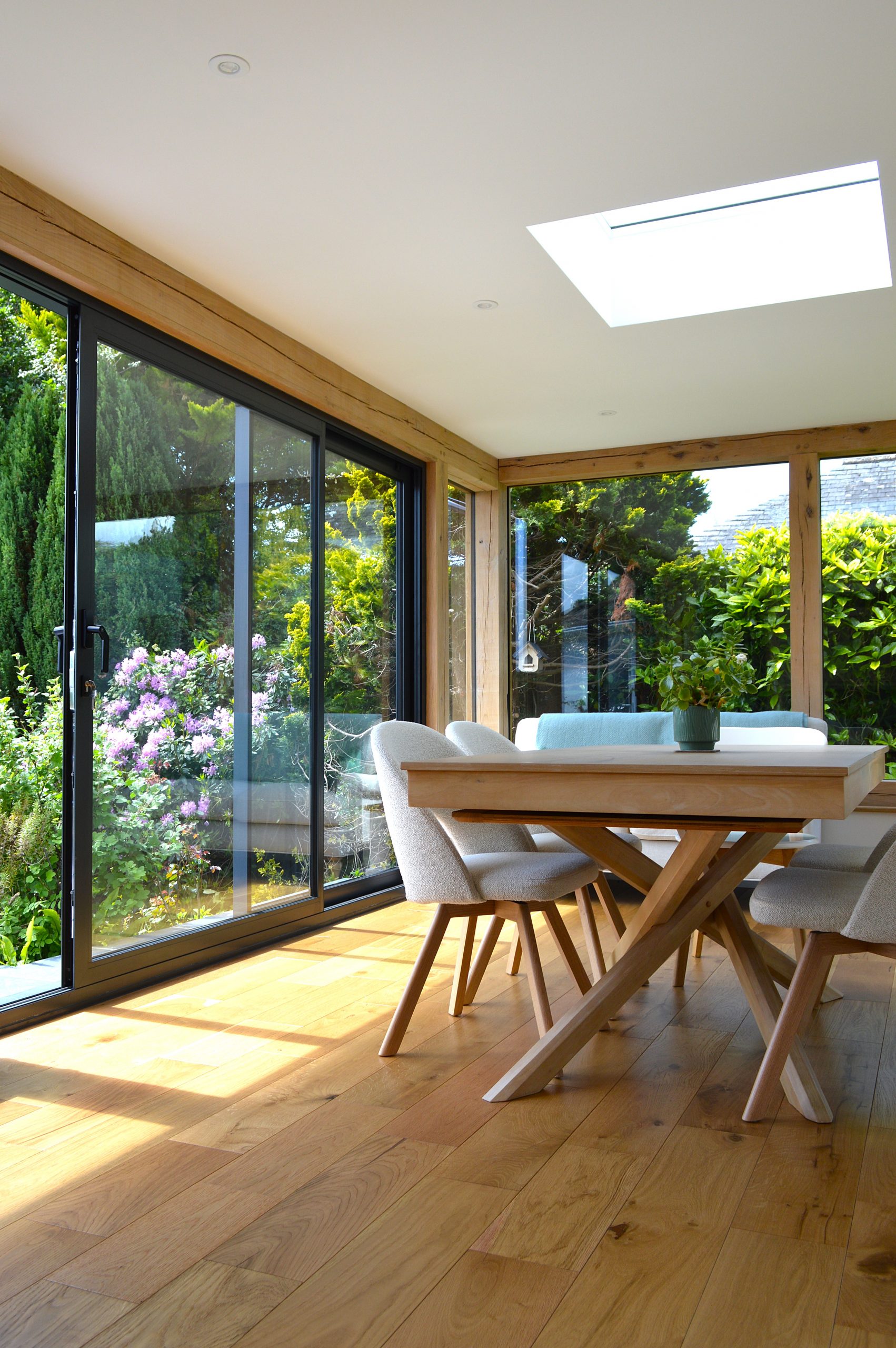 A beautifully simple oak framed extension, where rugged and robust natural materials shine.