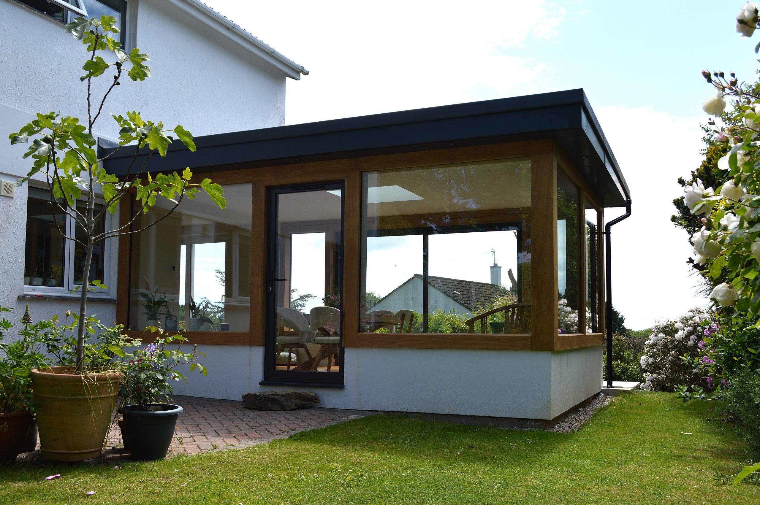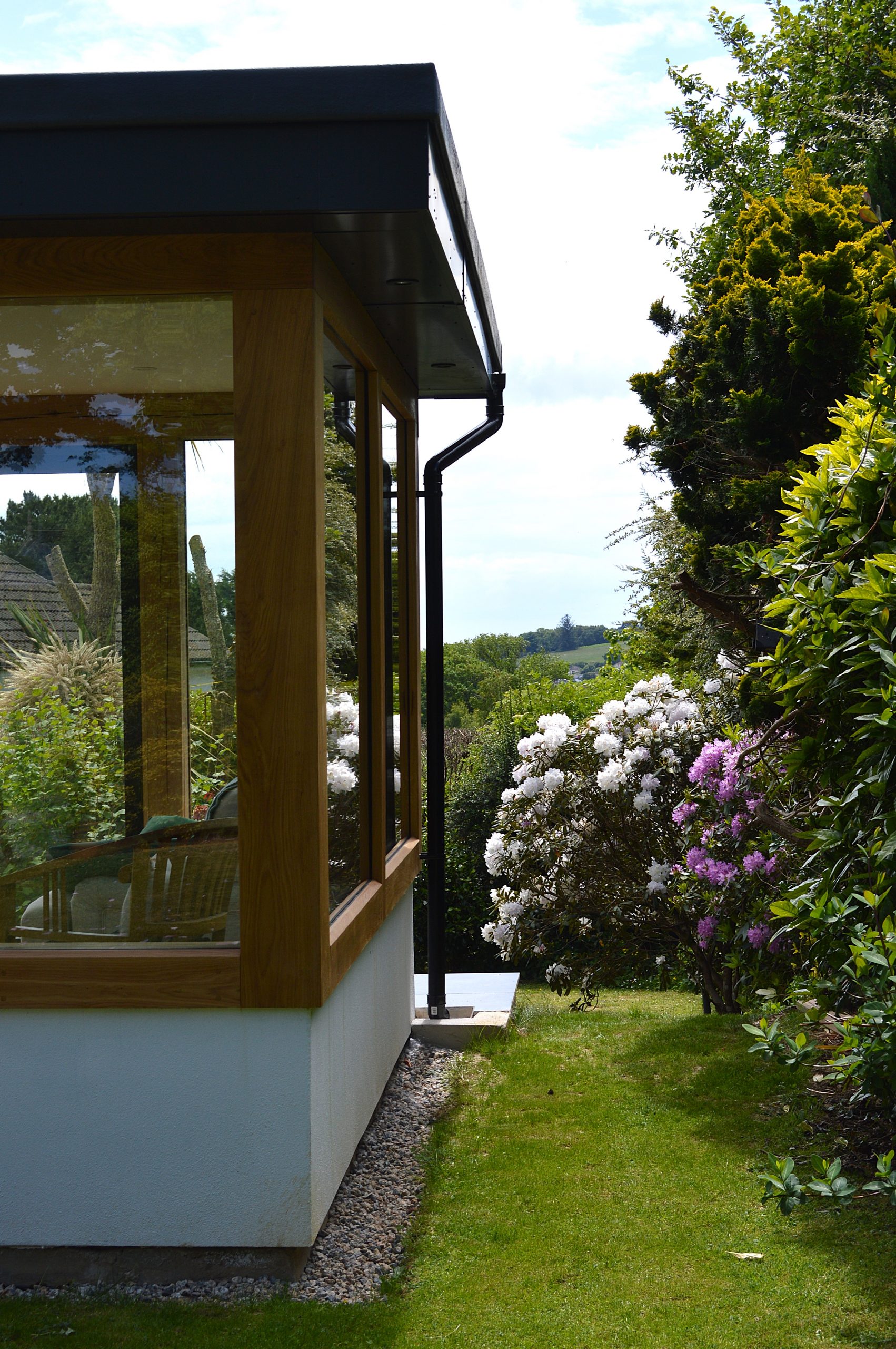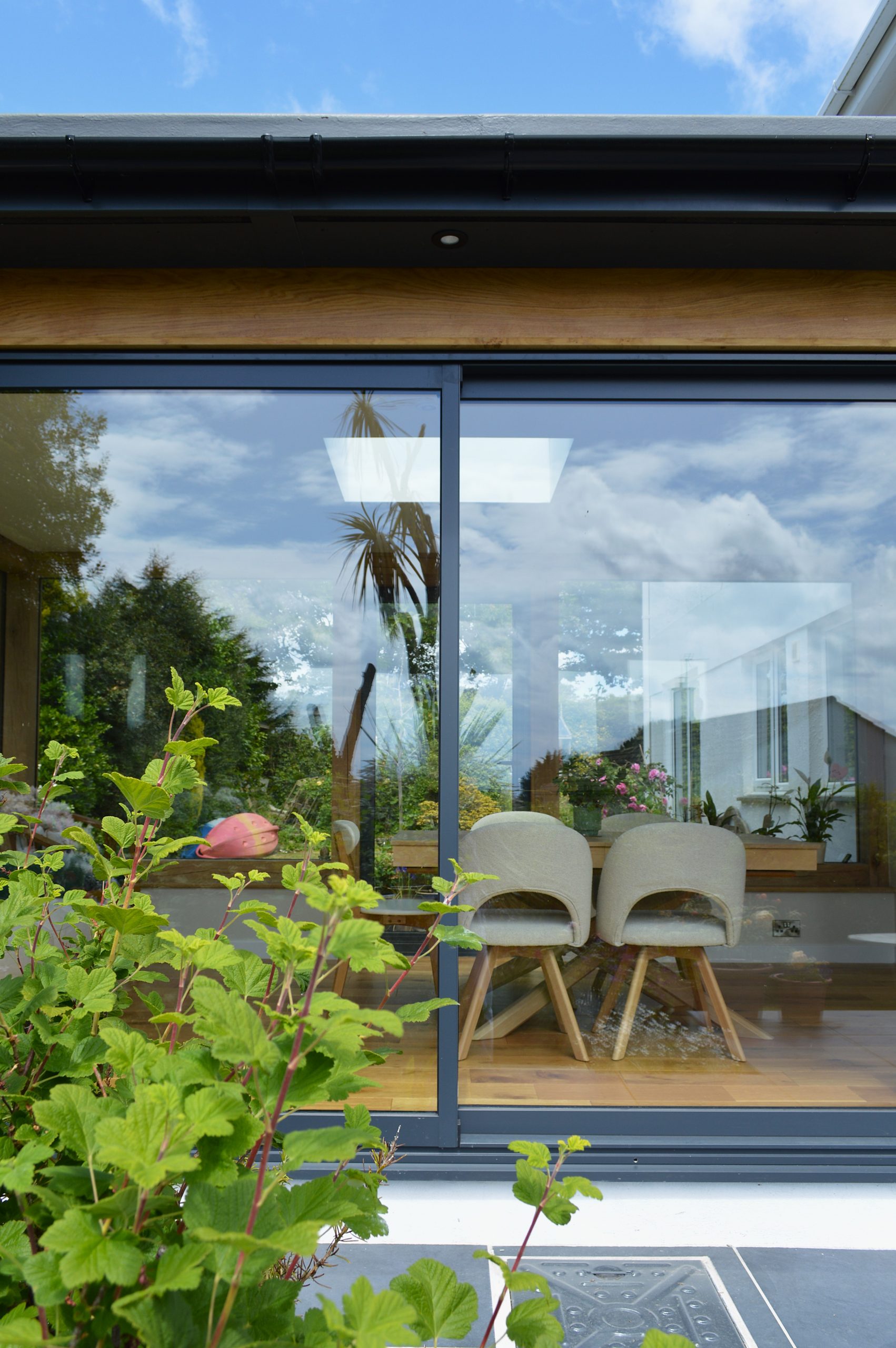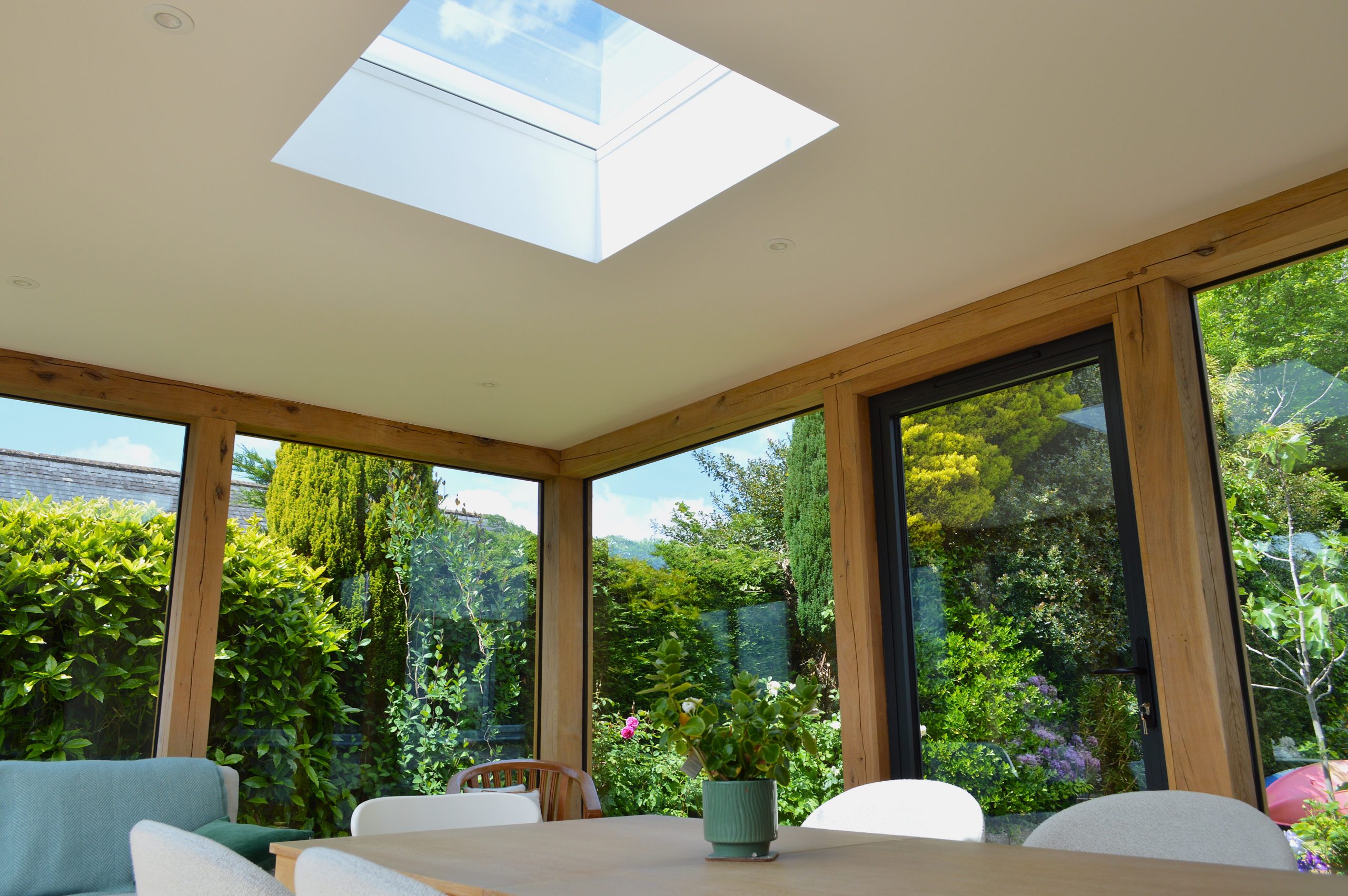 Once on site, we excavated to pour the slab, onto which a dwarf blockwork wall was built to receive the oak frame. Atop the oak, the team framed the roof, which featured a large fixed roof window. We installed a set of large sliders and a pedestrian door, as well as face fixed glazing around all three sides of the oak frame, bringing as much light as possible into the room.