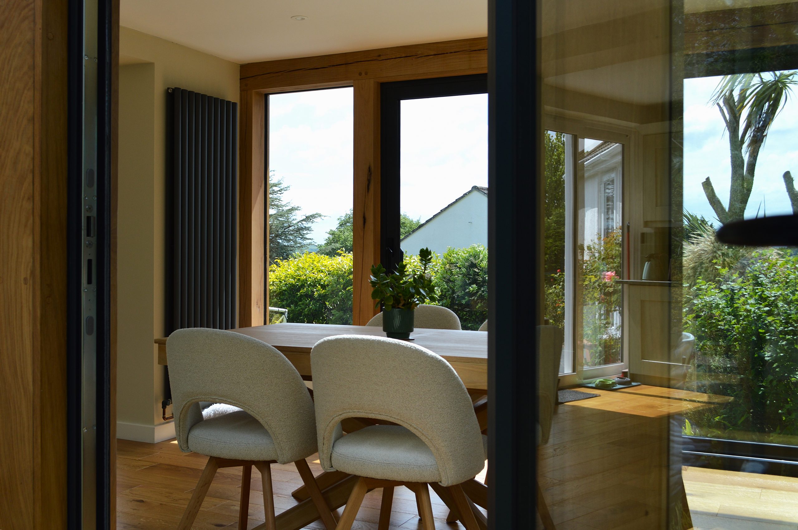 As part of the extension, we had knocked through to a small existing utility room, and the flooring and decor was continued into this room to make the whole space flow visually. Finishing touches included an anthracite column radiator, metal hardware for sockets and switches, and oak cills.